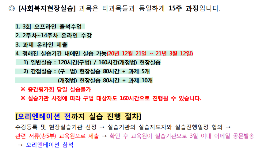 사회복지실습기관 방문 후 실습진행 순서입니다~(대학원기준*학교마다 차이가 있을 수 있습니다.!) 1. 실습기관 선정 2. 실습신청서, 실습생 프로파일을 작성하여 학교교무처에 제출(실습 1주일 전까지) 3. 학교에서 실습기관에 실습의뢰서 공문 발송 4. 실습기관은 실습신청 의뢰에 대한 회신을 학교로 발송 5. 실습개시 1번 실습기관 선정은 먼저 구두로 실천 가능한지 확인받고 학교교무처에 2번 절차를 진행하는 것을 권장합니다! ^^ 저희 대학원의 경우 위 절차가 끝나면 실습지도교수에게 실습신청서와 실습일정을 보고하고(교수의 기관방문 필요) 정식으로 실습이 시작됩니다~~ #사회복지실습 #사회복지실습절차 #실습진행순 #예비사회복지사 #실습기관선정 #실습공문